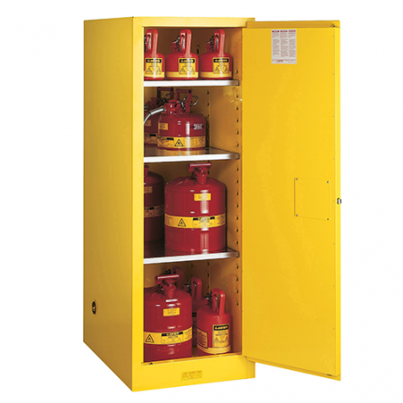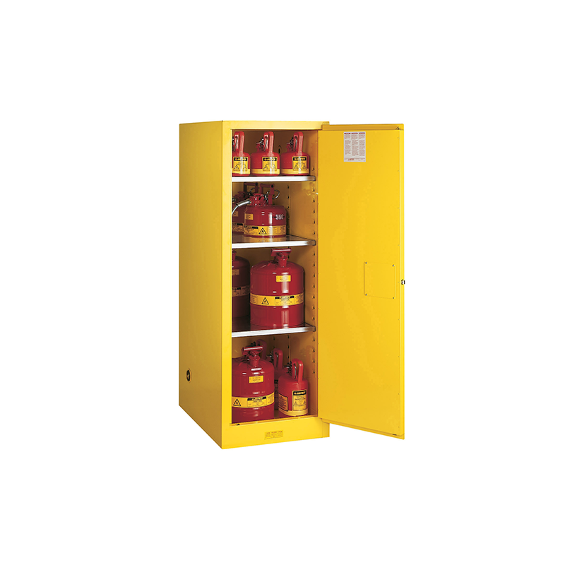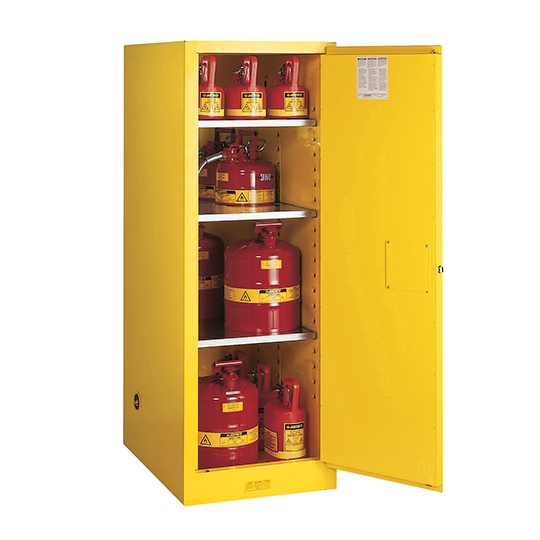 Szafa do przechowywania substancji łatwopalnych firmy JUSTRITE. Zapewniają one bezpieczne magazynowanie materiałów łatwopalnych, ograniczając w dużych stopniu zagrożenie pożarowe oraz działają na korzyść ochrony pracownika i mienia. Posiada dwa otwory, które wyposażone są w pułapkę przeciwogniową, skutecznie rozdmuchują ciepło w razie wybuchu pożaru. Sposoby zamykania szafy: na kluczyk lub przy użyciu kłódki. Pozwala to na zabezpieczenie zawartości szafy, przed dostępem osób niepowołanych. Trzypunktowy system zatrzasków, zapewnia szczelne domknięcie drzwiczek przy każdorazowym zamknięciu, nawet jeśli nie przekręcimy kluczyka w zamku. Możliwe jest uziemienia szafy w celu odprowadzenia ładunku elektrostatycznego, tym samym równoważą ryzyko pożaru w wyniku powstania przypadkowej iskry. Wyposażona w półki o odpowiedniej nośności oraz wytrzymałości (zgodnych z normą ANSI), półki w szafie pozostają minimalnie nachylone, tak aby kierować wyciekające płyny do tyłu szafy, a dalej w dół, do misy wychwytowej.