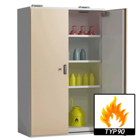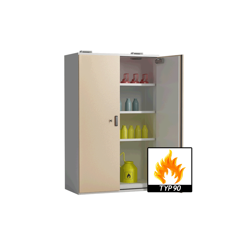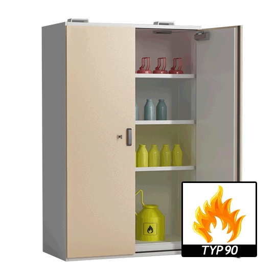 Szafa TYP 90 oznacza, że przez okres 90 minut w razie pożaru, chroni jej zawartość przed przedostaniem się płomieni do jej wnętrza! Szafa wykonana zgodnie z normą EN 14470-1 – TYP 90 do przechowywania substancji łatwopalnych w miejscu pracy. Szafa z zewnątrz wykonana z blachy stalowej lakierowanej w kolorze szarym, drzwi w kolorze jaskrawożółtym, aby w razie pożaru była widoczna i zwracała uwagę straży pożarnej lub ekipy ratunkowej na miejsce, gdzie są przechowywane niebezpieczne i łatwopalne substancje. Wnętrze szafy wykonane ze stali nierdzewnej. Póki z regulacją wysokości. Drzwi mogą występować w opcji z systemem samo zamykania się, w standardzie drzwi zamykają się powyżej temperatury 50°C.