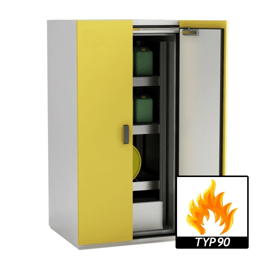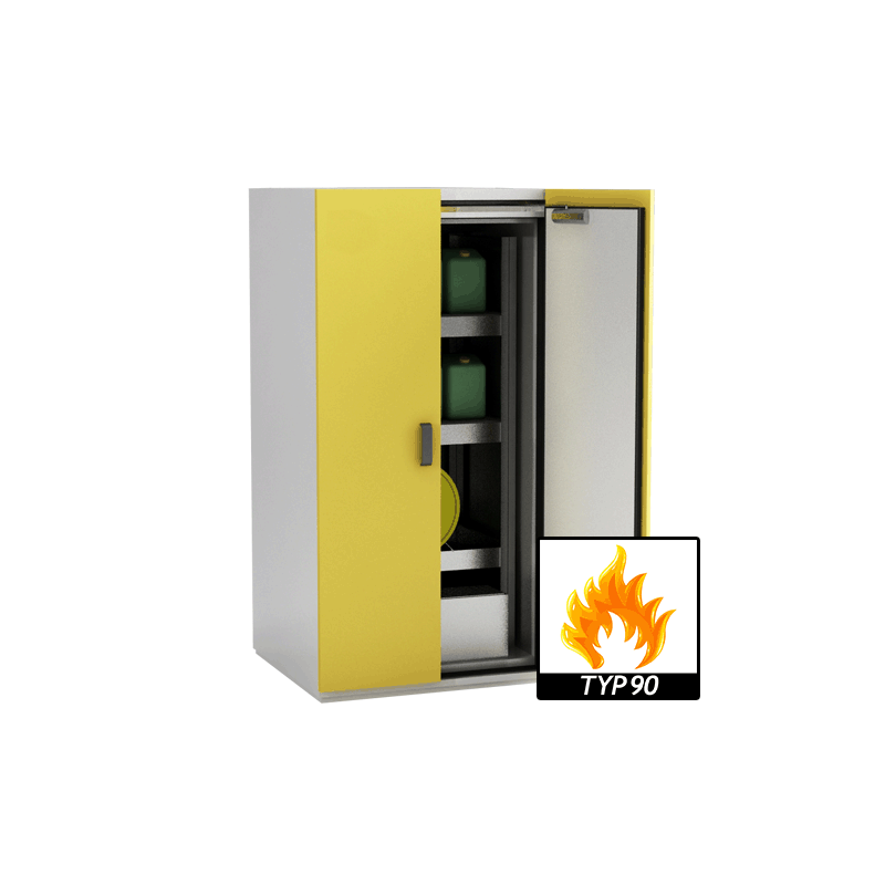 Szafa ognioodporna do przechowywania substancji niebezpiecznych w beczkach. Szafa wykonana zgodnie z normą EN 14470-1 – TYP 90 do przechowywania substancji łatwopalnych w miejscu pracy. Szafa z zewnątrz wykonana z blachy stalowej lakierowanej w kolorze szarym, drzwi w kolorze jaskrawożółtym, aby w razie pożaru była widoczna i zwracała uwagę straży pożarnej lub ekipy ratunkowej na miejsce, gdzie są przechowywane niebezpieczne i łatwopalne substancje. Wnętrze szafy wykonane ze stali nierdzewnej. Szafa posiada samozamykający się mechanizm na wypadek pożaru. Drzwi zostaną zamknięte automatycznie, kiedy temperatura wzrośnie nagle powyżej 50 stopni C.