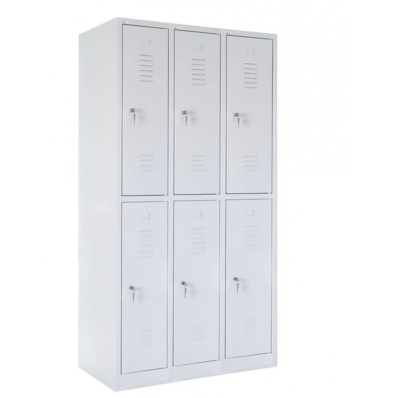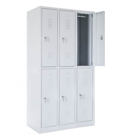 Sześciokomorowa szafa metalowa przeznaczona do przechowywania książek, śniadań itp. Szafa wyposażona w drążek z dwoma haczykami, wizytownik oraz wentylacje w górnej i dolnej części drzwi.