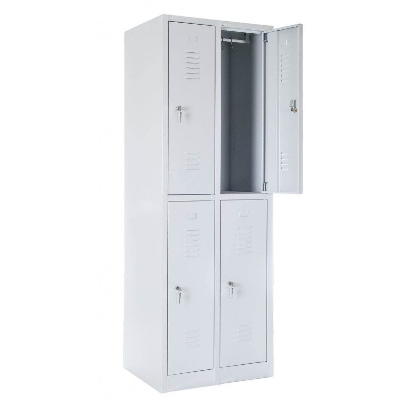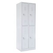 Czterokomorowa szafa metalowa przeznaczona do przechowywania książek, śniadań itp. Szafa wyposażona w drążek z dwoma haczykami, wizytownik oraz wentylacje w górnej i dolnej części drzwi.