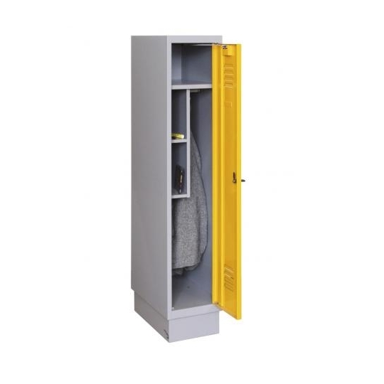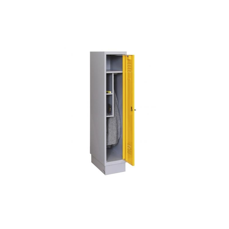 \n \n \nSzafa dla młodszych uczniów SUM S 310 wykonana została z blachy stalowej najwyższej jakości, a wieniec dolny z blachy ocynkowanej, która charakteryzuje się podwyższoną odpornością korozyjną. W drzwiach szafy wykonane zostały otwory umożliwiające prawidłową cyrkulację powietrza w szafie. Szafa dla młodszych uczniów SUM S 310 zamykana jest za pomocą zamka cylindrycznego ryglującego drzwi w jednym punkcie. Szafa standardowo znajduje się na cokole z giętej blachy o grubości 1,0 mm. \n \nWewnątrz szafy znajduje się przedział ubraniowy wyposażony w drążek z haczykami oraz dwie przegródki na podręczne drobiazgi. W górnej części znajduje się półka na książki. Po wewnątrznej stronie drzwi zamontowany jest dodatkowy haczyk. Szafa dla młodszych uczniów SUM S 310 malowana jest proszkowo na jeden z 15 kolorów palety Ral, co pozwala dopasowanie szafy do wymaganej kolorystyki.