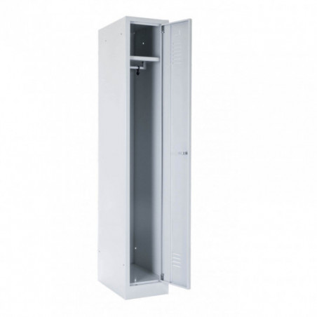 Jednokomorowa szafa metalowa przeznaczona do przechowywania ubrań. Szafa wyposażona w solidną górną półkę, drążek z dwoma haczykami, wizytownik oraz wentylacje w górnej i dolnej części drzwi.
