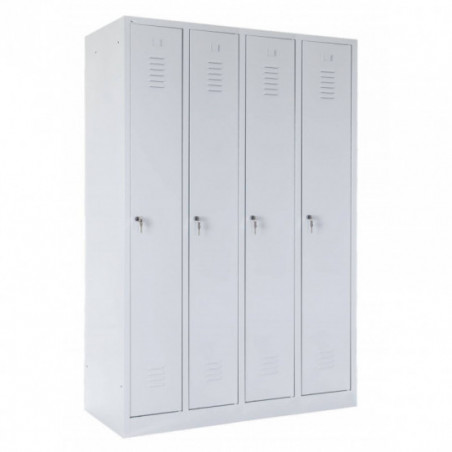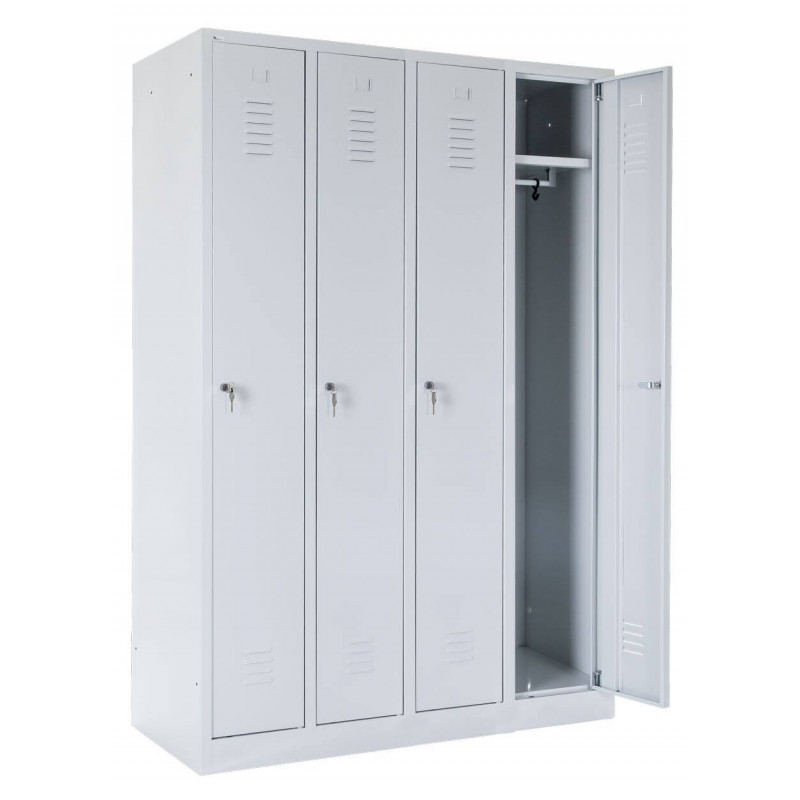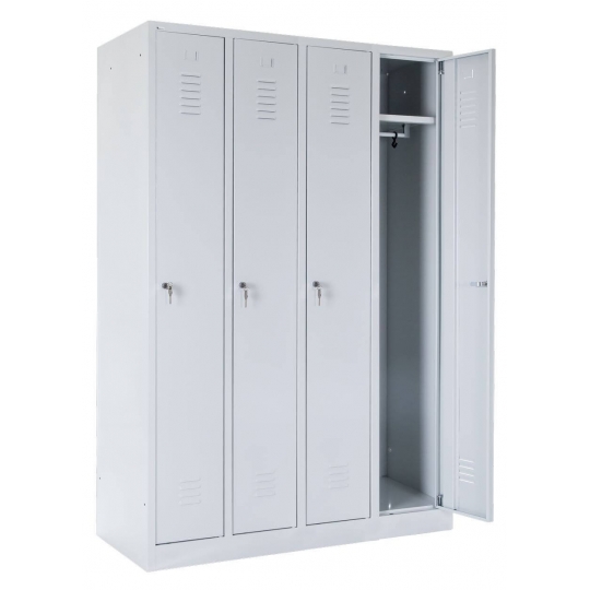 Czterokomorowa szafa metalowa przeznaczona do przechowywania ubrań. Szafa wyposażona w solidną górną półkę, drążek z dwoma haczykami, wizytownik oraz wentylacje w górnej i dolnej części drzwi.