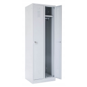 Dwukomorowa szafa metalowa przeznaczona do przechowywania ubrań. Szafa wyposażona w solidną górną półkę, drążek z dwoma haczykami, wizytownik oraz wentylacje w górnej i dolnej części drzwi.