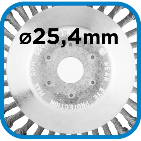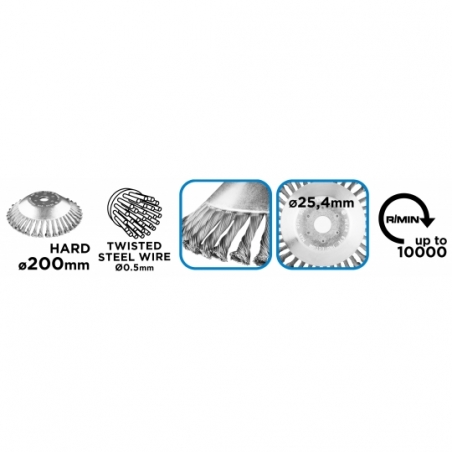 Szczotka druciana do kosy spalinowej 200 x 25,4 mm, twarda, średnica zewnętrzna 200 mm, średnica wewnętrzna otworu 25.4 mm, umożliwia czyszczenie kostek brukowych