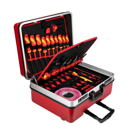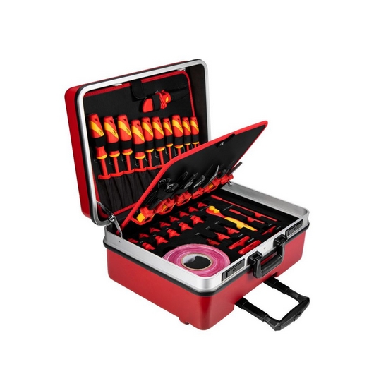 Zestaw narzędzi izolowanych do naprawy aut elektrycznych i hybrydowych 51 elementów, wymiar 500x415x260mm, waga 10,64 kg, wyposażenie:6 szt. szczypiec izolowanych: szczypce uniwersalne 200 mm, szczypce wygięte 200 mm, szczypce boczne 180 mm, szczypce płaskie 160 mm, szczypce do rur 250 mm, obcinak do kabli 250 mm, 1 szt. izolowany nóż, 7 sztuk wkrętaków izolowanych: SL2.5x75mm, SL3.0X100mm, SL3.5x100mm, SL4x100mm, PH1x80mm, PH2x100mm, PH3x150mm, 3 szt. izolowanych wkrętaków Torx: T20x100mm, T25x125mm, T30x130mm, 10 szt. izolowane samozaciskowe nasadki kablowe; 10mm, 20mm po 5szt, 2 szt. znaków ostrzegawczych z PVC, 1 szt. taśma ostrzegawcza (nieprzylepna): 500 m długości x 50 mm szerokości, czerwono – biała, 15 szt. nasadek 3/8" izolowanych rozmiary: 6mm/7mm/8mm/9mm/10mm/11mm/12mm/13mm/14mm/16mm/17mm/18mm/19mm/20mm/22mm, 3 szt. nasadek 3/8" izolowanych gwiazdkowych 100mm: M8/M10/M12, 1 szt. 3/8 ''izolowany klucz grzechotkowy 200mm, 2szt 3/8 ''izolowanych przedłużek: 125mm, 250mm