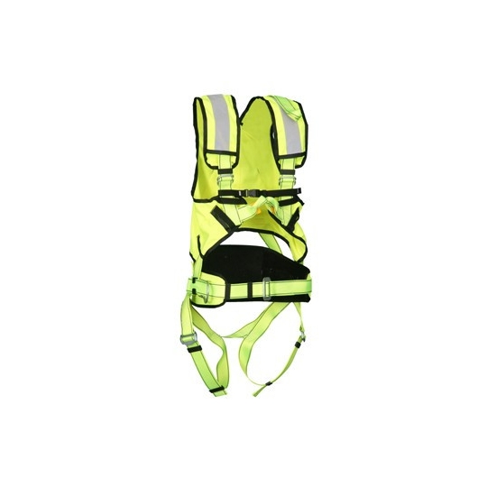 Szelki + kamizelka z taśmami odblaskowymi, wyposażone w tylny i przedni punkt zaczepowy; regulacja pasów udowych; pasów barkowych i pasa piersiowego; pas do pracy “w podparciu” z bocznymi klamrami zaczepowymi zgodny z normą PN-EN 358. Szelki wykonane z jaskrawej taśmy żółto-zielonej.
