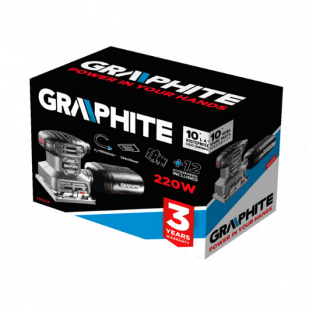Szlifierka oscylacyjna 220W, stopa 104 x 112 mm, ilość oscylacji 26000 min⁻¹, amplituda oscylacji 1 mm, akcesoria: 3 stopy wymienne, kwadratowa, prostokątna, trójkatna, papier ścierny 9szt, pojemnik na pył z filtrem - 1 szt; masa 1.2 kg
