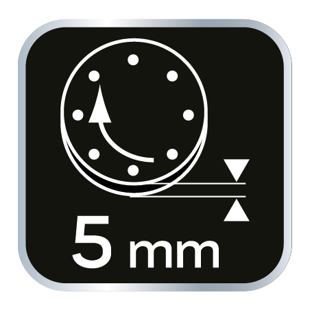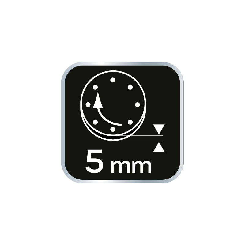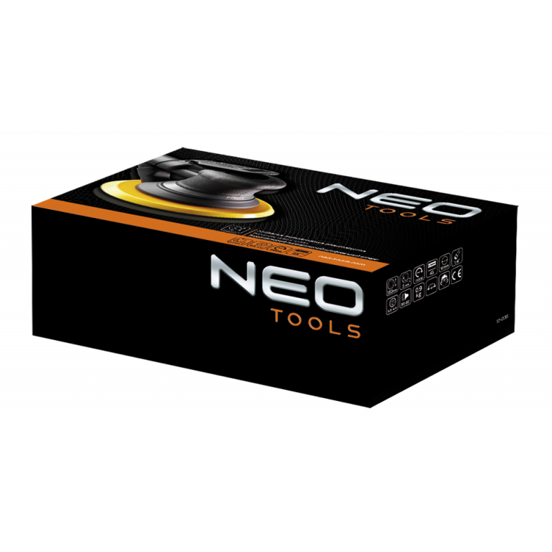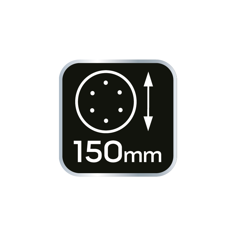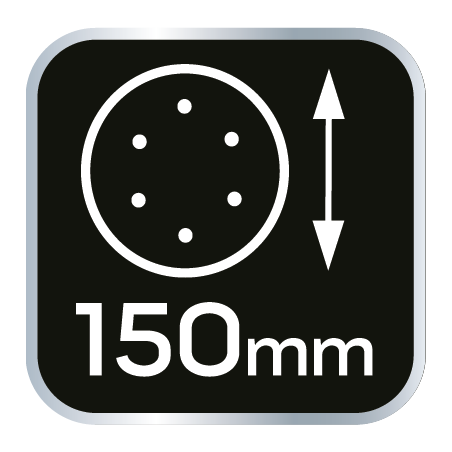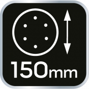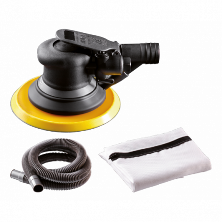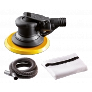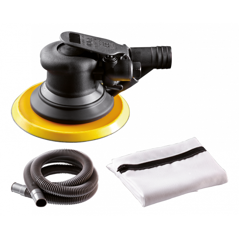 Szlifierka mimośrodowa pneumatyczna 150 mm, 11 000 obr.-1, promień oscylacji 5 mm, ciśnienie robocze 6.3 - 7 bar, średni pobór 45 l/min., system odsysania pyłu, mocowanie papieru na rzep, waga 0.9 kg, CE
