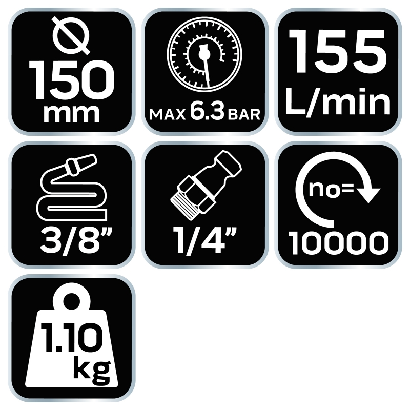 Szlifierka mimośrodowa pneumatyczna, średnica tarczy 125/150, 12000 obr.-1, centralny system odsysania pyłu, ciśnienie robocze 6.3 bar, średnie zużycie powietrza 133 l/min., złącze 1/4" ,wąż 3/8" , waga 1,1 kg, CE