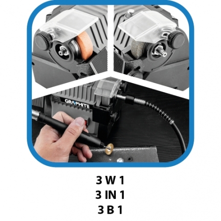 Mini szlifierka stołowa akumulatorowa 3w1 - szlifierka stołowa, polerka, szlifierka z wałkiem giętkim, regulacja prędkości 3000 – 9000 min-1, średnica tarczy / szczotki 50mm, blokada wrzeciona, pojemnik na pył