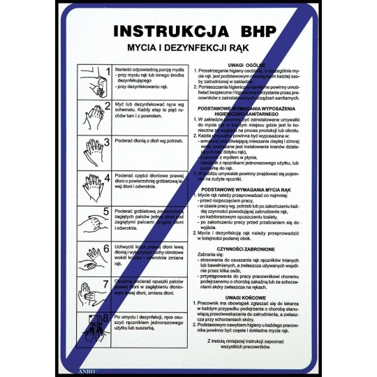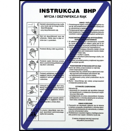 Instrukcja BHP „Instrukcja BHP mycia i dezynfekcji rąk”. - format znaku L w rozmiarze 210x290 - wykonany z płyty PCV