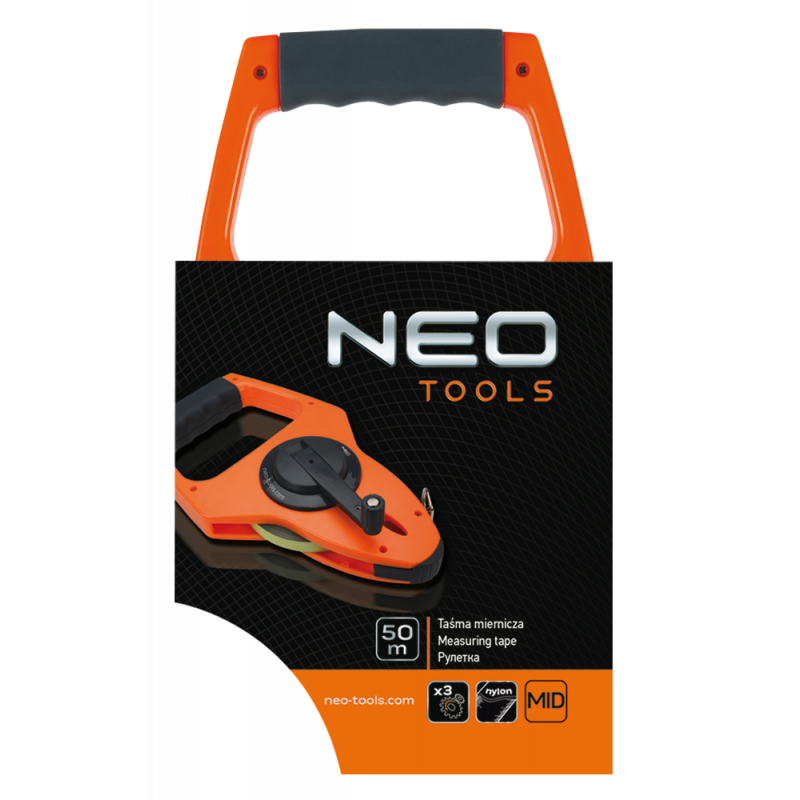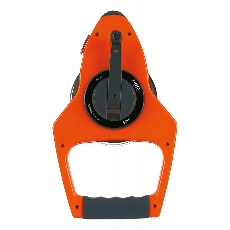 Taśma miernicza stalowa 50 m x 13 mm, obudowa z tworzywa, uchwyt dwumateriałowy, nylonowa powłoka chroniąca podziałkę przed starciem, zaczep końcowy, przesunięty punkt "0", przekładnia napędu zwijania 3:1