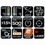 Przyrząd do szacowania temperatury (pirometr) NEO (nr ref. 75-275) służy do pomiaru temperatury powierzchni obiekt z dokładnością do +/- 1,5%+1,5 °C w zakresie -50 – 400 °C. Może być używany do szacowania temperatury różnych, gorących, niebezpiecznych lub trudno dostępnych obiektów bez kontaktu. To urządzenie składa się z optyki, czujnika temperatury, w jego skład wchodzi wzmacniacz sygnału, obwód przetwarzania i wyświetlacz LCD. Optyka zbiera energię podczerwoną emitowaną przez obiekt i skupia ją na czujniku. Czujnik zamienia energię na sygnał elektryczny, a ten jest wyświetlony jako odczyt cyfrowy. Urządzenie działa bezdotykowo. Pomiar dokonywany jest w stopniach Celsjusza lub Fahrenheita, a jego wynik wyświetlany na kolorowym wyświetlaczu LCD. Pirometr zasilany jest dwoma bateriami AAA. Urządzenie jest wodoszczelne, posiada stopień ochrony IP44. Urządzenie nie jest wyrobem medycznym.