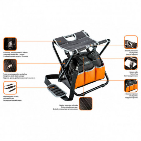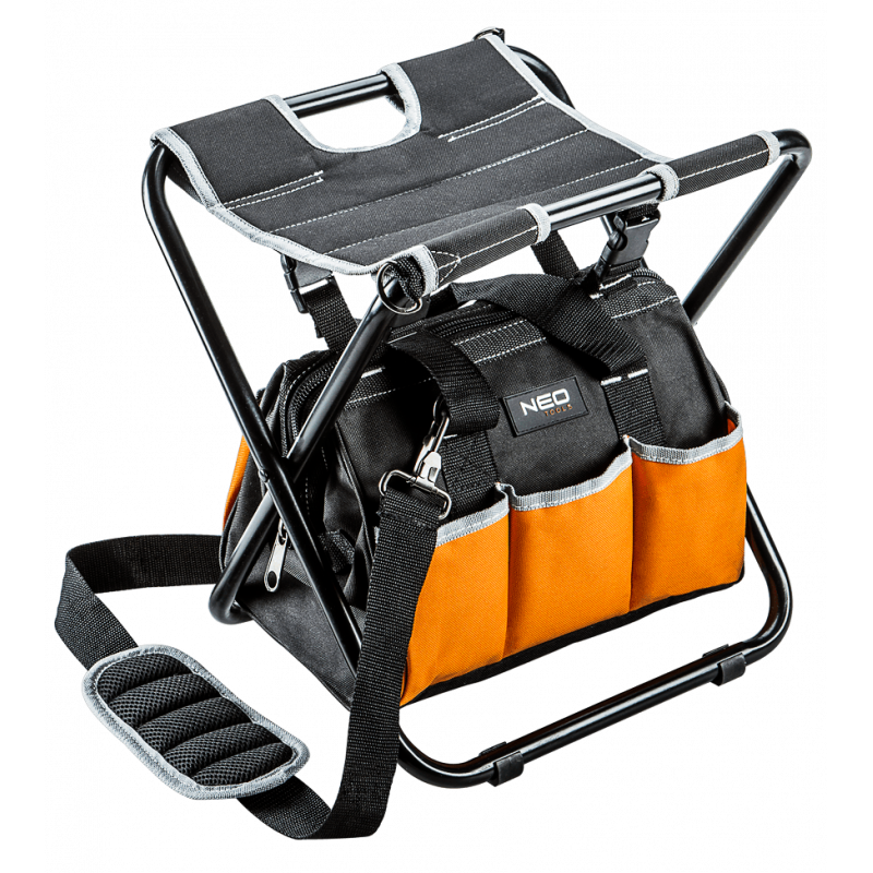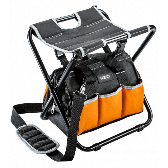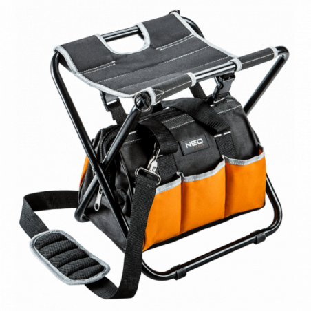 Stołek z torbą monterską (nr ref. 84-306) poliester 600D, 6 kieszeni zewnęrznych, pasek na ramie, uchwyt, klamry na torbę.