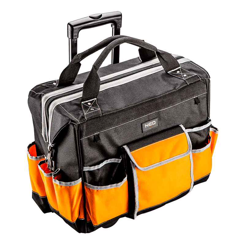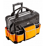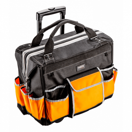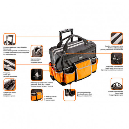 Torba monterska na kołach NEO (nr ref. 84-302) poliester 600D, teleskopowy uchwyt z blokadą, koła, 11 kieszenie zewnętrznych, 6 kieszeni wewnętrznych, sztywna konstrukcja, podwójny szew zamka.