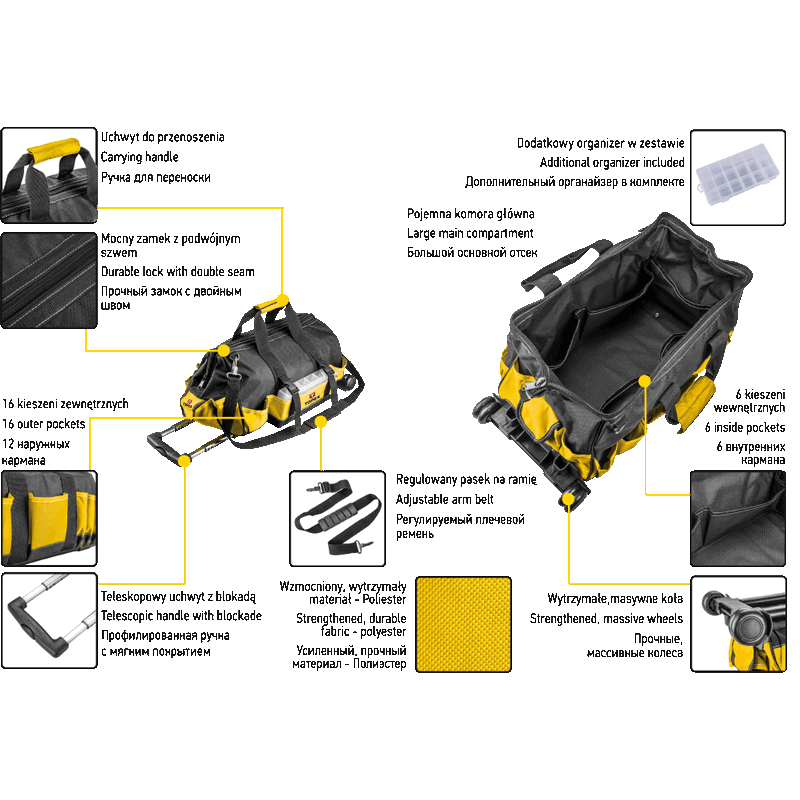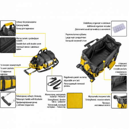 Torba monterska na kołach Topex (nr ref. 79R449) poliester, teleskopowy uchwyt z blokadą, koła, 16 kieszenie zewnętrznych, 6 kieszeni wewnętrznych, sztywna konstrukcja.