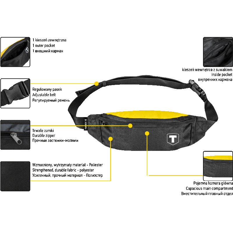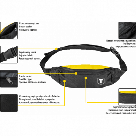 Saszetka, materiał poliester, 1 kieszeń wewnętrzna, 1 komora główna, mocne zamki, regulowany pas.