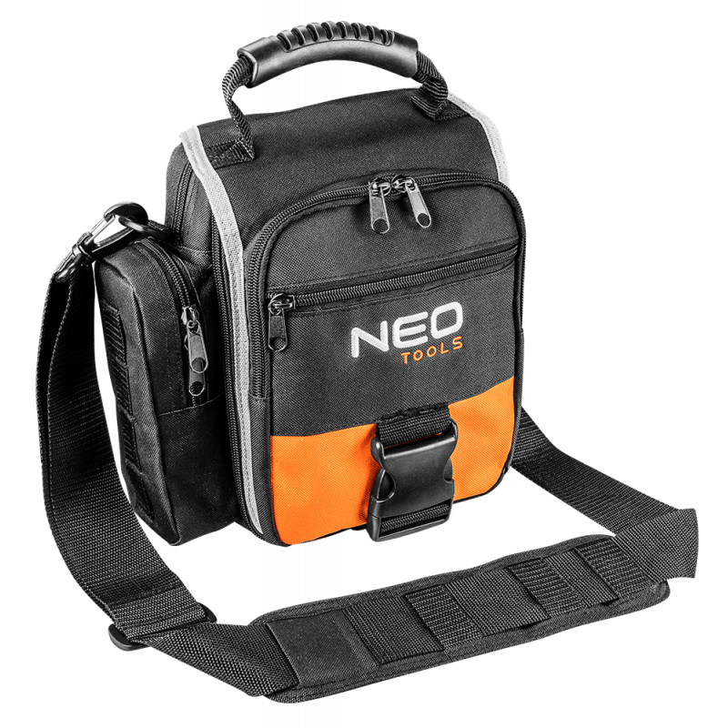 Torba narzędziowa materiał poliester, 4 kieszenie wewnętrzne, 4 kieszenie zewnętrzne, rozkładana konstrukcja, uchwyt do przenoszenia, regulowany pasek, zaczepy na narzędzia, zaczepy na pasek, mocne zamki