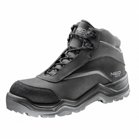 Trzewiki robocze S3 SRC, bez elementów metalowych, rozmiar 39, nubukowe, podwyższone parametry odporności na przesiąkanie i przemiękanie, elementy odblaskowe, antypoślizgowa podeszwa z systemem absorbującym wstrząsy, odporna na ścieranie, oleje, benzynę i inne rozpuszczalniki organiczne, podeszwa wykonana z PU o dwóch gęstościach, podnosek z włókna szklanego wytrzymujący uderzenie do 200J, kewlarowa wkładka antyprzebiciowa, wkładka antyelektrostatyczna, sznurówki z wplecioną nicią odblaskową, czubek buta zabezpieczony dodatkową warstwą ochronną, zapiętek i język wzmocnione tkaniną Oxford, but wykonany w kategorii S3 SRC (SRC- odporność na poślizg na podłożu ceramicznym pokrytym roztworem laurylosiarczanu sodu (SLS) i na podłożu ze stali pokrytym glicerolem), certyfikat CE