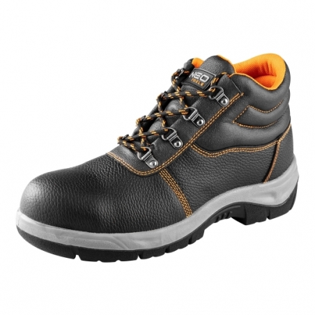 Trzewiki robocze, klasa S1 SRC, skórzana cholewka z wytłaczanej dwoiny, metalowe szlufki, podwójne i potrójne szwy, stalowy podnosek zapewniający ochronę przed uderzeniami z energią równą 200J, zabudowana pięta; podeszwa dwumateriałowa, odporność na oleje, benzynę i inne rozpuszczalniki organiczne; właściwości antyelektrostatyczne; absorbcja energii w części piętowej według klasyfikacji obuwia bezpiecznego wg normy EN ISO 20345, rozmiar 39