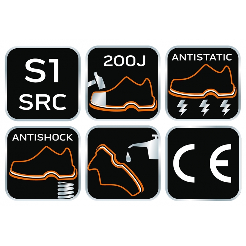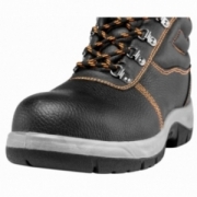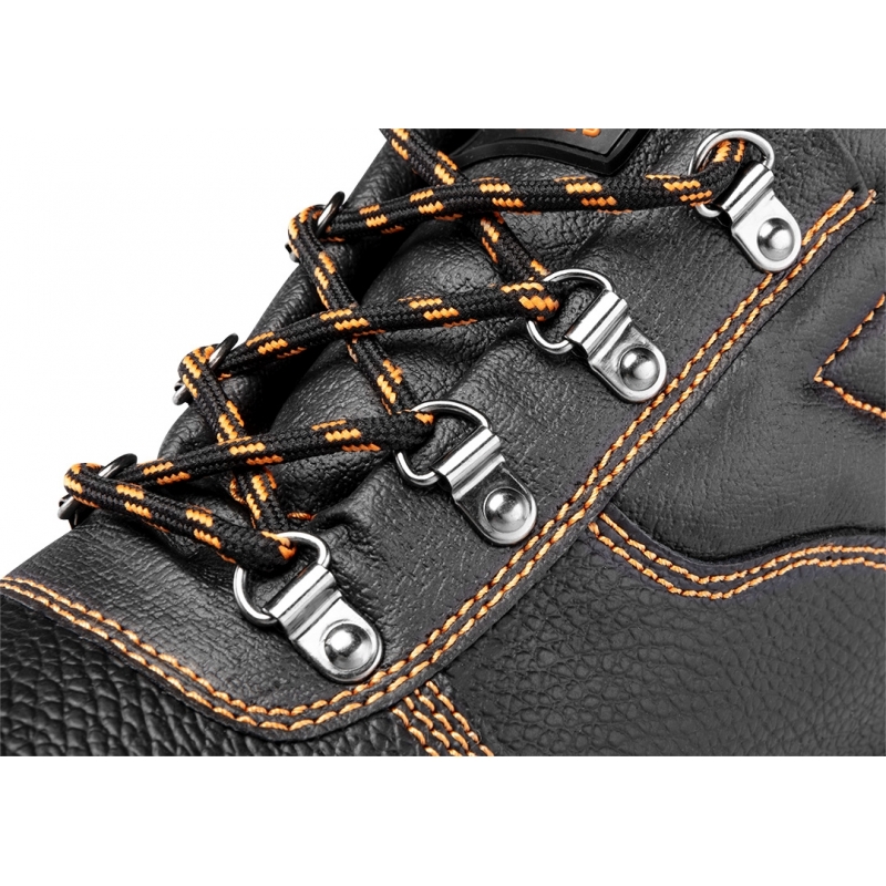 Trzewiki robocze, klasa S1 SRC, skórzana cholewka z wytłaczanej dwoiny, metalowe szlufki, podwójne i potrójne szwy, stalowy podnosek zapewniający ochronę przed uderzeniami z energią równą 200J, zabudowana pięta; podeszwa dwumateriałowa, odporność na oleje, benzynę i inne rozpuszczalniki organiczne; właściwości antyelektrostatyczne; absorbcja energii w części piętowej według klasyfikacji obuwia bezpiecznego wg normy EN ISO 20345, rozmiar 44