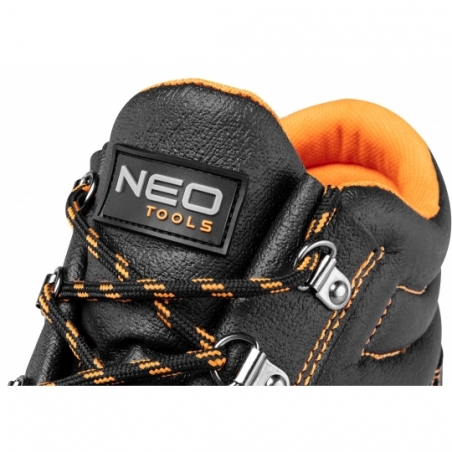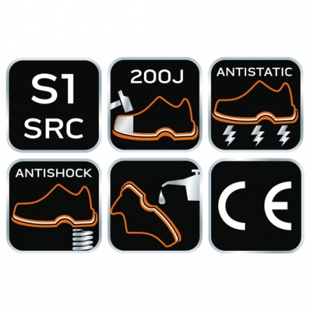 Trzewiki robocze, klasa S1 SRC, skórzana cholewka z wytłaczanej dwoiny, metalowe szlufki, podwójne i potrójne szwy, stalowy podnosek zapewniający ochronę przed uderzeniami z energią równą 200J, zabudowana pięta; podeszwa dwumateriałowa, odporność na oleje, benzynę i inne rozpuszczalniki organiczne; właściwości antyelektrostatyczne; absorbcja energii w części piętowej według klasyfikacji obuwia bezpiecznego wg normy EN ISO 20345, rozmiar 45