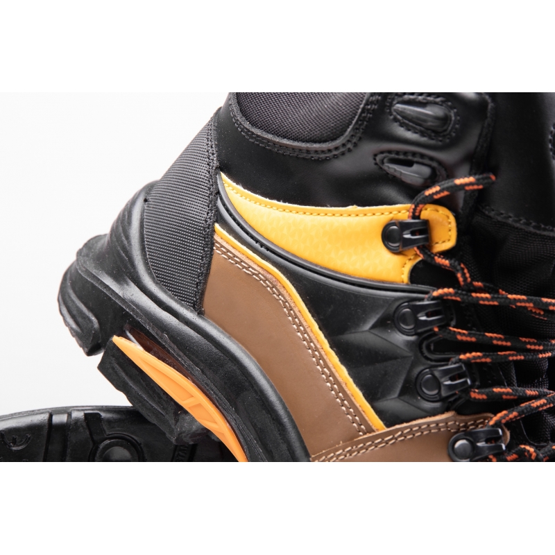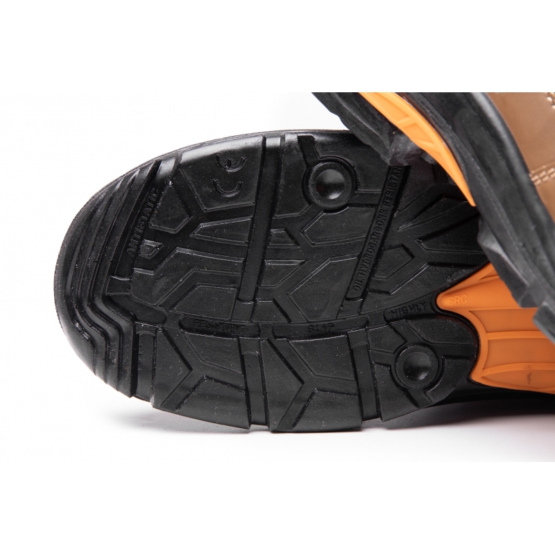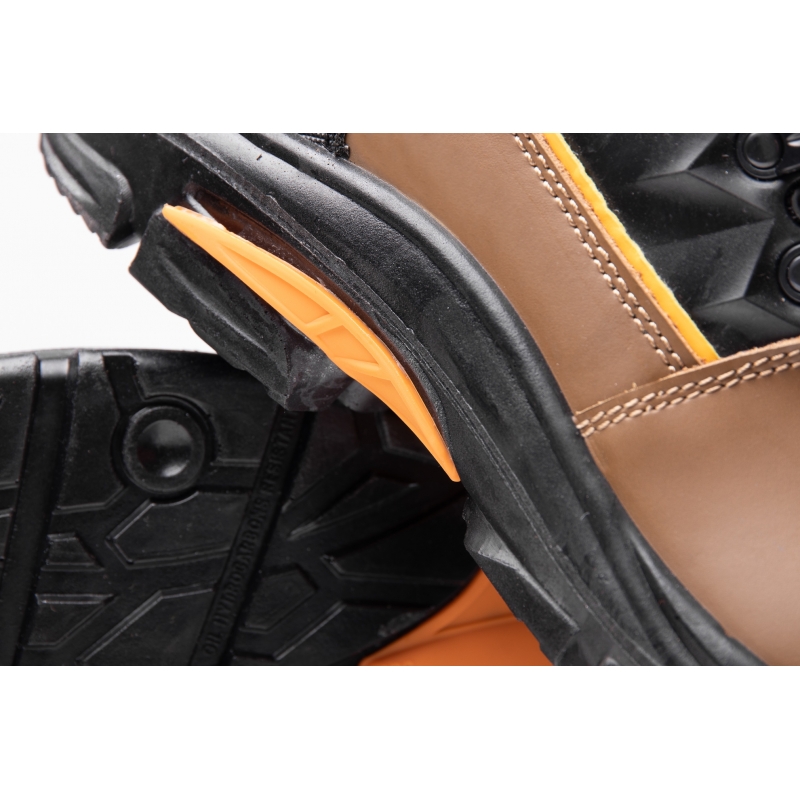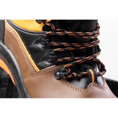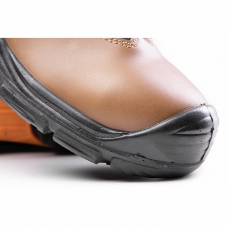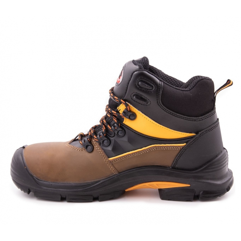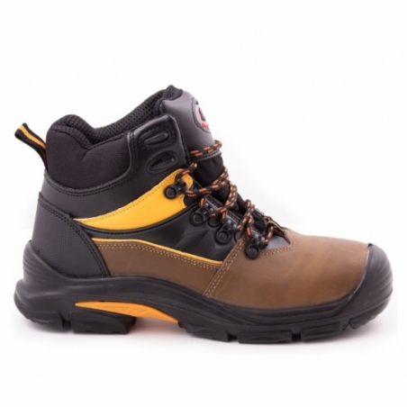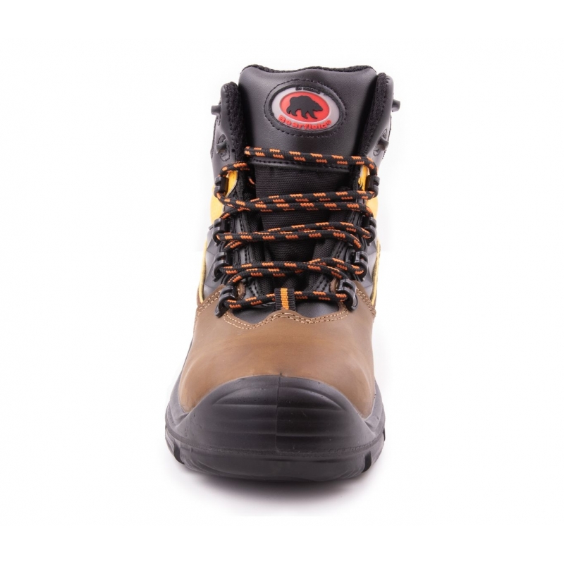 TRZEWIK POLSTAR BEARFIELD K08 S3 SRCTrzewiki Bearfield K08 to wytrzymałe obuwie ochronne za kostkę, wykonane ze skóry typu crazy horse o grubości 1,8–2,0 mm. Materiał charakteryzuje się podwyższoną wodoodpornością, zapewniając odporność na absorpcję wody przez 60 minut. Model wyposażony jest w szeroki kompozytowy podnosek oraz kompozytową wkładkę antyprzebiciową, chroniącą przed przekłuciem do 1100 N. Wnętrze buta wykończono higroskopijną, przewiewną wyściółką, która zapobiega otarciom i odprowadza wilgoć. Podeszwa PU/PU o podwójnej gęstości jest odporna na węglowodory, olejoodporna, antyelektrostatyczna i posiada właściwości antypoślizgowe SRC. Kolorowa wstawka TPU zwiększa trwałość i stabilność. Wyżej nalany podnosek sprawdza się idealnie przy pracach brukarskich.