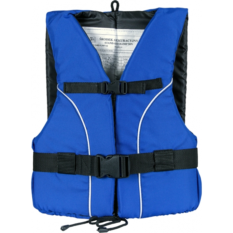 Kamizelka asekuracyjna 50N. - zapinana na dwa pasy z klamrami - posiada pasek krokowy uniemożliwiający wypłynięcie osoby użytkującej z kamizelki - w dolnej części kamizelka posiada troczki za pomocą których kamizelkę można dopasować do swojej sylwetki - wypełnienie kamizelki stanowi pianka polietylenowa o zwiększonej gęstości i wyporności - znajduje zastosowanie w wypożyczalniach sprzętu wodnego, pensjonatach i hotelach oferujących możliwość uprawiania sportów wodnych - spełnia wymagania normy PN-EN ISO 12402-5:2007/A1