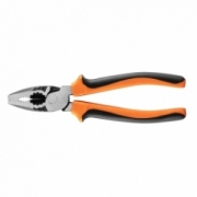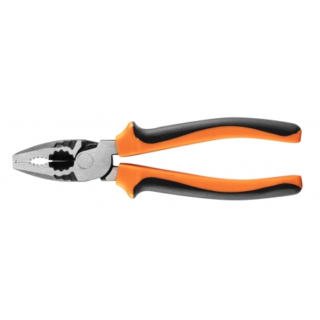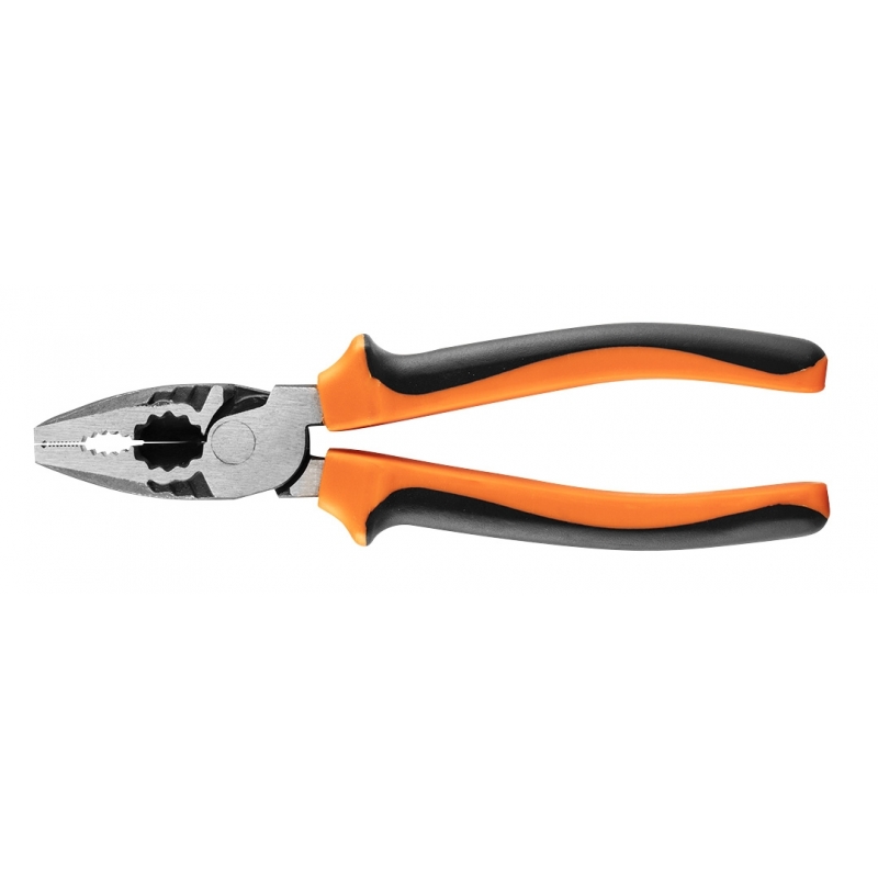 Szczypce uniwersalne długość 180mm, 40% oszczędności siły dzięki przesunięciu trzpienia bliżej szczęk, stal chromowo niklowa antykorozyjna, uchwyt dwukomponentowy TPR+ABS, ząbkowana głowica, dodatkowy otwór w szczękach do przytrzymania np. gwoździa
