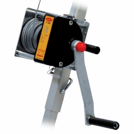Urządzenie podnosząco-opuszczające. - wciągarka służąca do wciągania ludzi lub materiału - płyta montażowa wyposażona w cztery śruby do zamontowania do podpór trójnoga lub innej podstawy zgodnie z wymaganiami - przewód ze stali galwanizowanej o średnicy 5.00 mm i długości max 20 m - wyposażony w stalowy karabińczyk w funkcji konektora - mechanizm dźwigni obrotowej służący do podnoszenia lub opuszczania - korpus wykonany ze stali galwanizowanej - spełnia wymagania normy EN1496