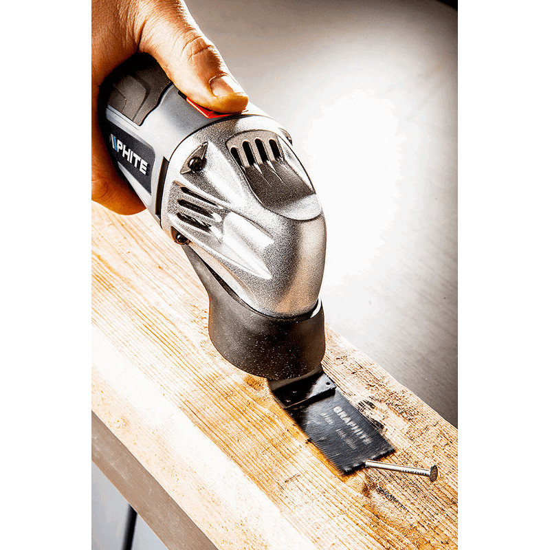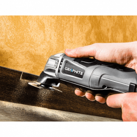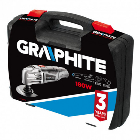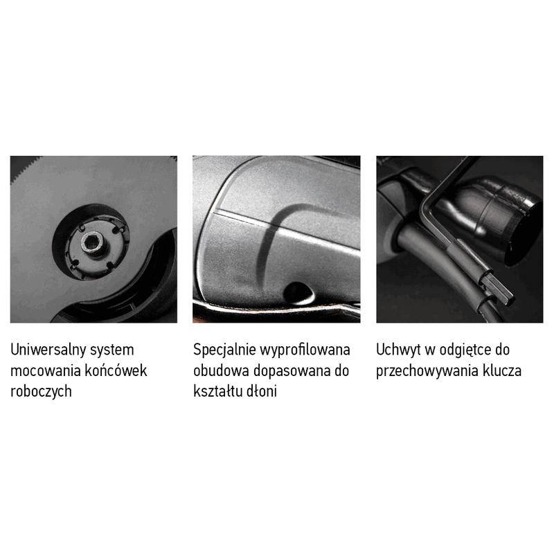 Urządzenie wielofunkcyjne 180W, ilość oscylacji 20 000 min⁻¹, kąt oscylacji 2,8°, stopa 80x80x80 mm, (LxH) 300 x 70 mm, masa 1.35 kg, akcesoria; końcówki robocze - 6 szt, papier ścierny 5 szt, nakładka odprowadzania pyłu z adapterem + klamra - 1 kpl, klucz sześciokątny, walizka