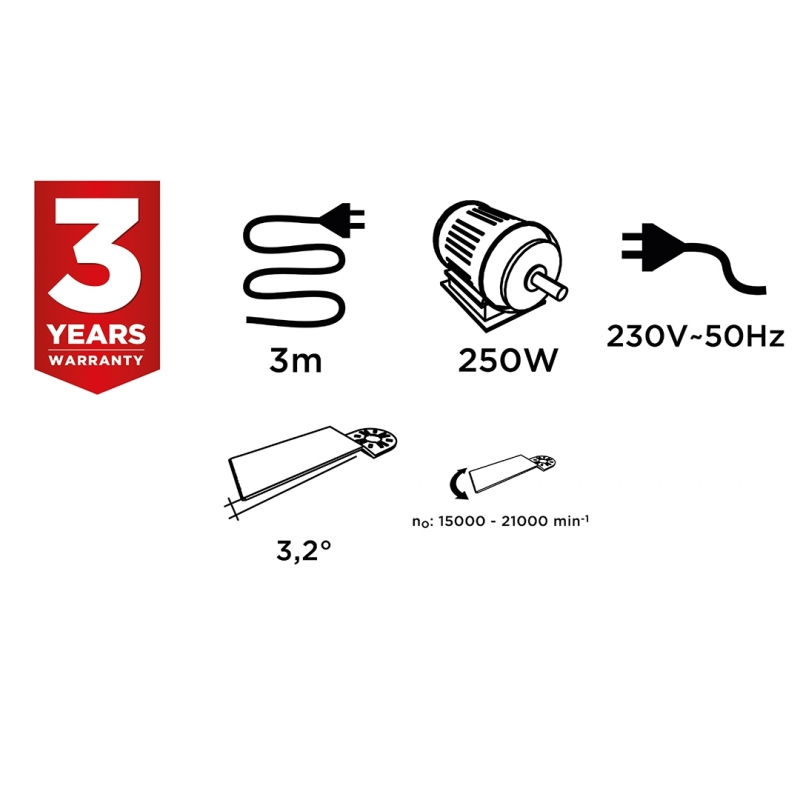 Urządzenie wielofunkcyjne 250 W, ilość oscylacji 15000-21000 min⁻¹, walizka, mocą 250 W oraz ilością oscylacji 15000-21000/min, które można regulować. Kąt oscylacji to 3.2°. Dołączony do zestawu adapter umożliwia odsysanie wiórów, sześć końcówek roboczych, stopę szlifierską, brzeszczot z nasypem do ceramiki, skrobak, brzeszczot półokrągły do drewna i tworzyw, brzeszczot wgłębny szeroki i brzeszczot wgłębny wąski. akcesoria papier ścierny (5 sztuk), nakłada, walizka oraz odgiętka z uchwytem na kluczyk amulowy M5. Urządzenie umożliwia prace jedną ręką, a jego lekka waga i poręczna wielkość (300 x 70 mm)