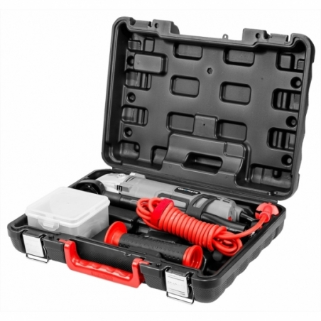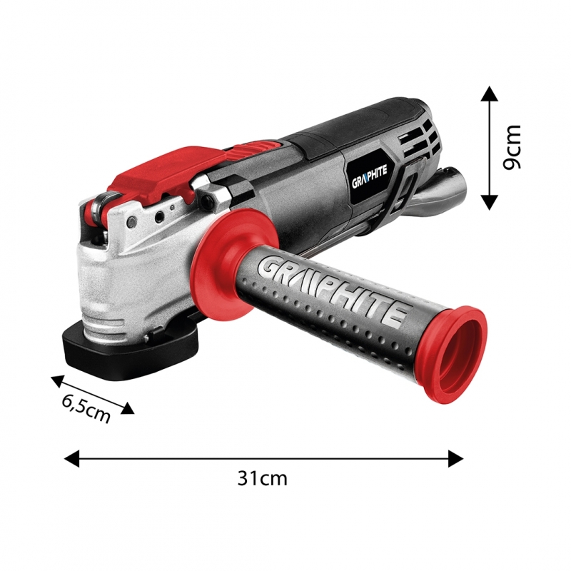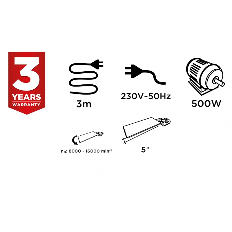 Urządzenie wielofunkcyjne 500 W, ilość oscylacji 8000-16000 min?1, walizka 59G025 ,kąt oscylacji to 5°. Dołączony do zestawu adapter umożliwia odsysanie wiórów,akcesoria: końcóweki robocze pozwala na szlifowanie, cięcie i skrobanie metalu, drewna oraz ceramiki przez narzędzie,stopę na rzep, skrobak, brzeszczot półokrągły HCS do drewna, brzeszczot półokrągły z nasypem węglika HM do ceramiki, brzeszczot wąski do drewna HCS 20 mm oraz wąski brzeszczot do metalu HSS 34 mm, papier ścierny P80 (5 sztuk), walizka oraz dodatkowa rękojeść. Urządzenie umożliwia prace jedną ręką, a jego lekka waga (1.45 kg) i poręczna wielkość (300 x 70 mm