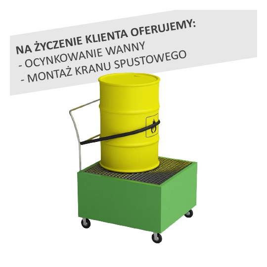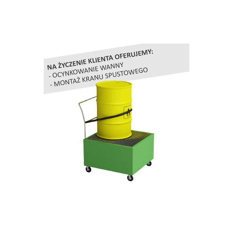Dzięki zastosowaniu wanny wychwytowej na kółkach można w łatwy sposób uniknąć rozlania niebezpiecznych substancji podczas transportu. Dostosowana rączka pozwala w szybki sposób na transport palety. Kratka z możliwością zdejmowania ułatwia czyszczenie. Zbudowana ze stalowej blachy grubości 3 mm. Do palety dołączone są kółka.