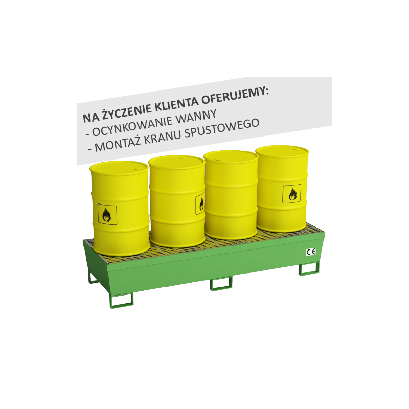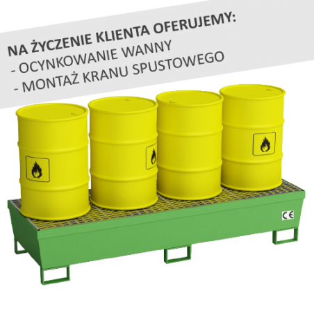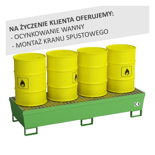 Wanna w całości wykonana ze spawanej stali. Konstrukcja ocynkowana ogniowo. Specjalne ułożenie wanny ociekowej zapewnia brak jakichkolwiek wycieków poza nią, a co za tym idzie, gwarantuje czystość pracy. Wanna przystosowana do bezpiecznego składowania 4 beczek 200 litrowe w linii. Przystosowana do składowania materiałów zapalnych, wysoce zapalnych i silnie zapalnych.