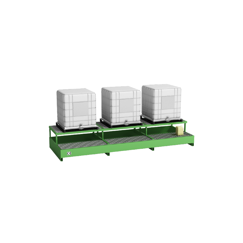 Wykonana ze spawanej 3 mm stali pomalowana na zielono lub wybrany kolor palety RAL z ocynkowaną kratownicą nośną. Specjalna konstrukcja zbiornika ociekowego eliminuje rozlewanie się płynów poza część zbiorczą wanny, co gwarantuje czystość w miejscu pracy. Przystosowana do składowania materiałów zapalnych, wysoce zapalnych i silnie zapalnych. Wanna z praktycznym stojakiem do pobierania próbek.