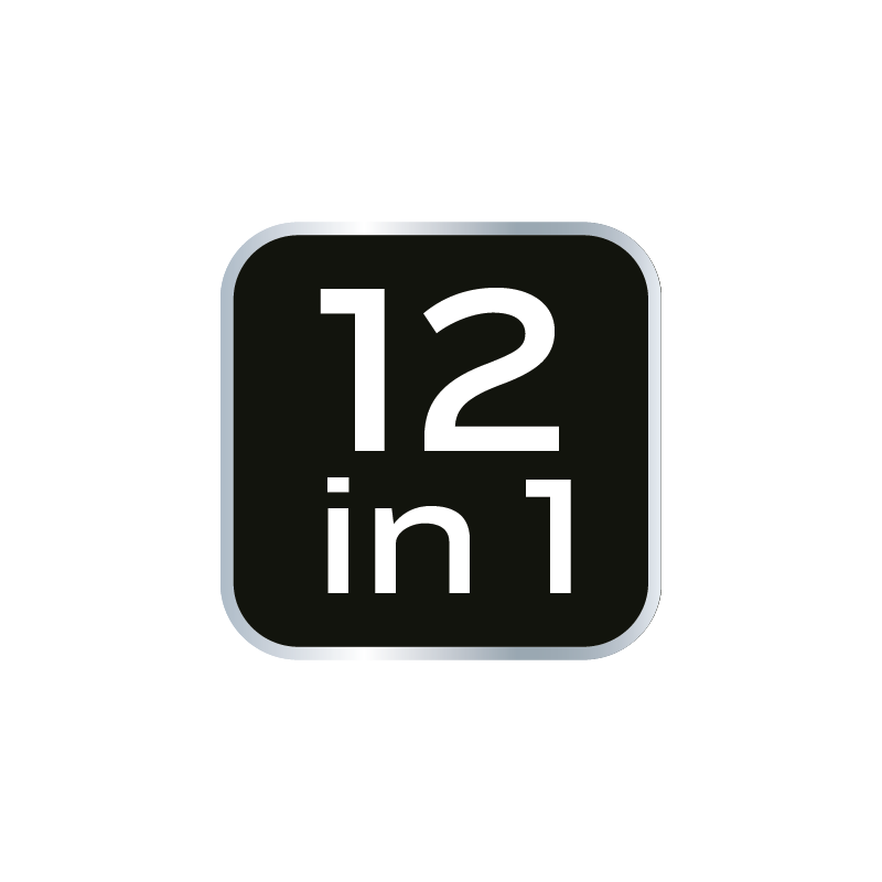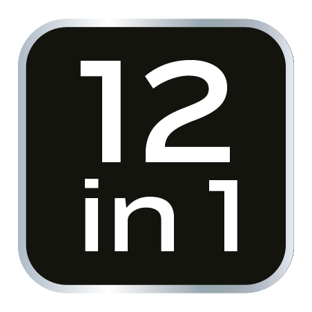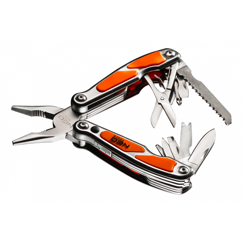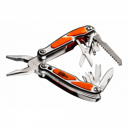 Narzędzie wielofunkcyjne, szczypce, otwieracz do puszek, otwieracz do butelek, wkrętak PH2, dwa płaskie wkrętaki (duży i mały), nóż, piła do drewna, pilnik, nożyczki, szpikulec, LED przód, waga 290 g, długość po złożeniu 100 mm, długość po rozłożeniu 150 mm, ostrza ze stali 420, obudowa z elementami gumy, blokada przed samoczynnym zamknięciem, nylonowy futerał