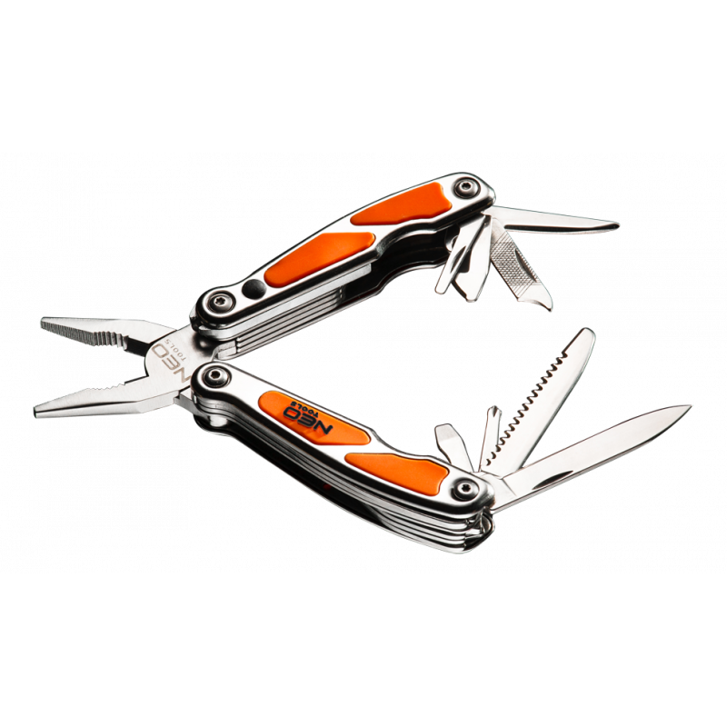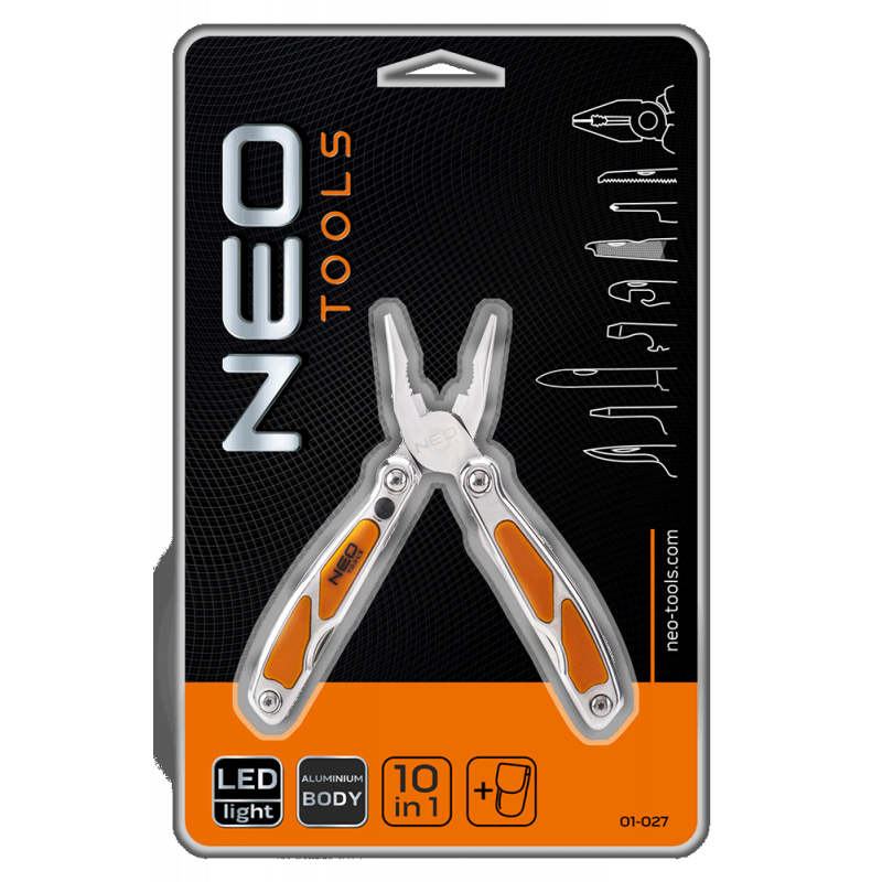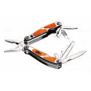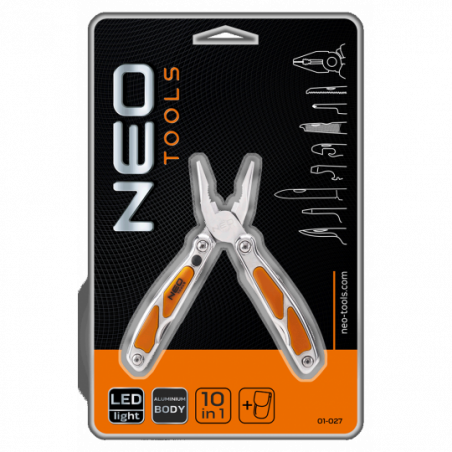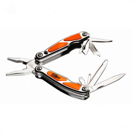 Narzędzie wielofunkcyjne, szczypce, wkrętak PH2, wkrętak SL, nóż, piła do drewna, pilnik, szpikulec, otwieracz do puszek, otwieracz do butelek, LED, waga 241 g, długość po złożeniu 105 mm, długość po rozłożeniu 165 mm, ostrza ze stali 420, obudowa aluminiowa z plastikowymi elementami, nylonowy futerał