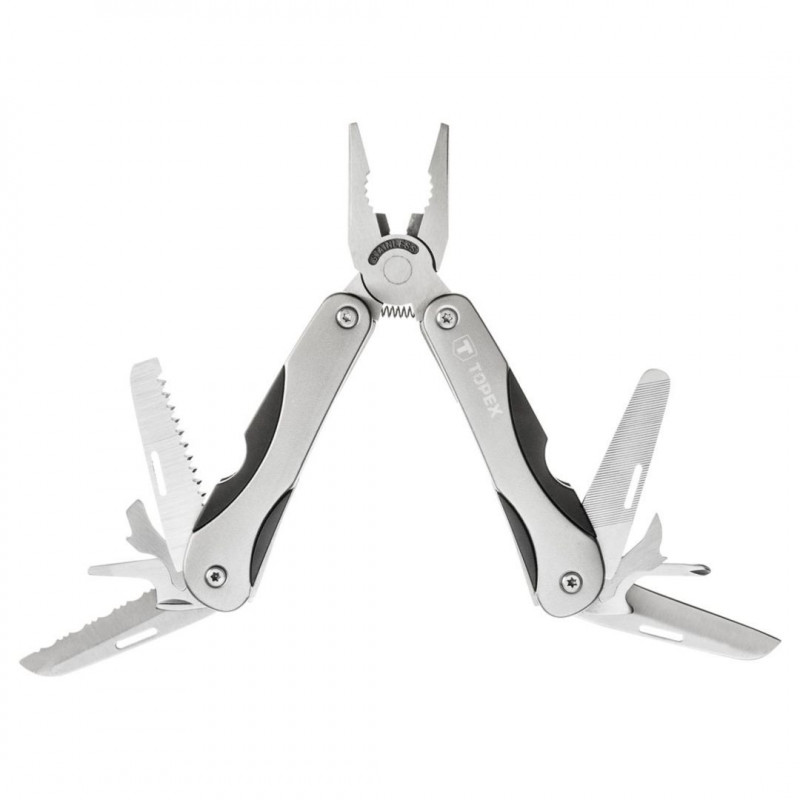 Narzędzie wielofunkcyjne, korpus ze anodowanego aluminium, ostrza ze stali nierdzewnej 420, szczypce, ostrze płaskie, ostrze z zębami, piła do drewna, pilnik, otwieracz do puszek, otwieracz do butelek, wkrętak SL, wkrętak PH, waga 265 g, długość po zamknięciu 102 mm, długość po otwarciu 160 mm, nylonowy futerał