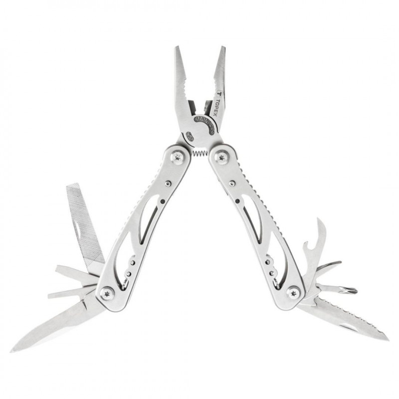 Narzędzie wielofunkcyjne, korpus ze stali nierdzewnej, ostrze ze stali nierdzewnej 420, szczypce, ostrze płaskie, piła do drewna, pilnik, otwieracz do puszek i butelek, dwa wkrętaki SL, wkrętak PH, szpikulec, waga 222 g, długość po zamknięciu 105 mm, długość po otwarciu 165 mm, nylonowy futerał