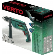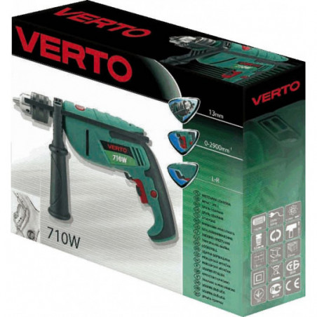 Wiertarka udarowa 710W, uchwyt kluczykowy 13 mm, obroty 0-2900 min⁻¹, udar 0-46400 min⁻¹, prawo/lewo, średnica wiercenia w drewnie/betonie/stali 25/13/10 mm, gwint wrzeciona 1/2’’x 20 mm, (LxW) 310 x 200 mm, masa 1.9 kg