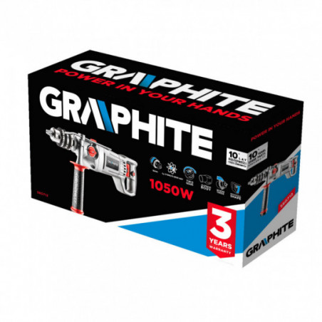 Wiertarka udarowa dwubiegowa 1050W, uchwyt kluczykowy 16 mm, obroty I: 0-900, II: 0-2500 min⁻¹, udar I: 0-14000, II: 0-40000 min⁻¹, prawo/lewo, maksymalna średnica wiercenia w drewnie/betonie/stali 40/20/16 mm, gwint wrzeciona ½’’x 20 mm, masa 3,5 kg, karton