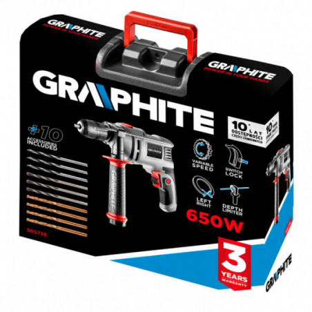 Wiertarka udarowa 650W, uchwyt bezkluczykowy 13 mm, obroty 0-3000 min⁻¹, udar 0-48000 min⁻¹, prawo/lewo, maksymalna średnica wiecenia w drewnie/betonie/stali 28/13/10 mm, gwint wrzeciona ½’’x 20 mm, (LxW) 295 x 210 mm, ogranicznik prędkości maksymalnej, ogumowana rękojeść główna, masa 2 kg, akcesoria: rękojeść dodatkowa ze schowkiem na wiertła, listwa ogranicznika głębokości, wiertła 10 szt., walizka