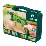Wiertarka udarowa 1050W, uchwyt kluczykowy 13 mm, obroty 0-3000 min⁻¹, udar 0-48000 min⁻¹, prawo/lewo, średnica wiercenia w drewnie/betonie/stali 40/16/13 mm, gwint wrzeciona 1/2’’x 20 mm, masa 2.2 kg, akcesoria: kluczyk, rękojeść dodatkowa + akcesoria
