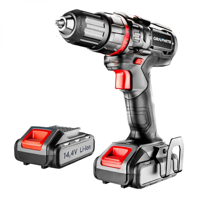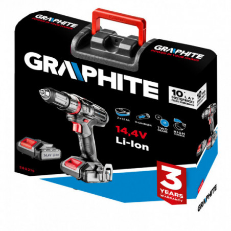 Wiertarko-wkrętarka akumulatorowa 2x14,4V, Li-Ion/1,5Ah, obroty I: 0-390 min⁻¹ II: 0-1000 min⁻¹, prawo/lewo, uchwyt samozaciskowy 1-10 mm, zakres momentu obrotowego 1-20 (oraz opcja wiercenia), ładowanie akumulatora 1 godz., hamulec wrzeciona, (LxH) 240 x 230 mm, masa 1.56 kg, akcesoria: bit dwustronny, walizka
