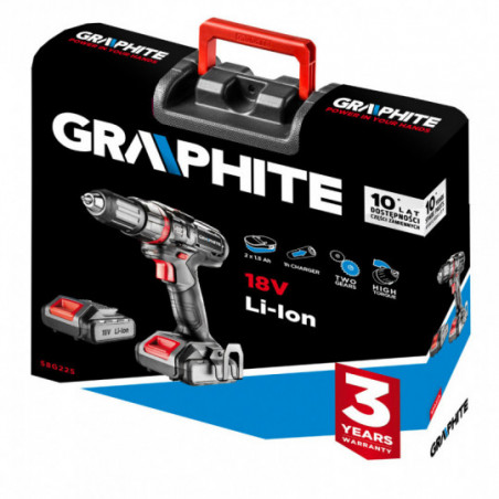 Wiertarko-wkrętarka akumulatorowa 2 x 18V, Li-Ion/1,5Ah, obroty I: 0-400 min⁻¹ II: 0-1100 min⁻¹, prawo/lewo, uchwyt samozaciskowy 1-10 mm, zakres momentu obrotowego 1-20 (oraz opcja wiercenia), ładowanie akumulatora 1 godz., hamulec wrzeciona, (LxH) 240 x 230 mm, masa 1.56 kg, akcesoria: bit dwustronny, walizka