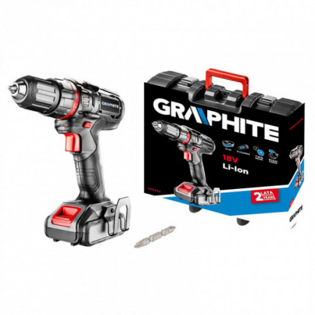 Wiertarko-wkrętarka akumulatorowa 18V, Li-Ion/1,5Ah, obroty I: 0-400 min⁻¹ II: 0-1100 min⁻¹, prawo/lewo, uchwyt samozaciskowy 1-10 mm, zakres momentu obrotowego 1-20 (oraz opcja wiercenia), ładowanie akumulatora 1 godz., hamulec wrzeciona, (LxH) 240 x 230 mm, masa 1.56 kg, akcesoria: bit dwustronny, walizka