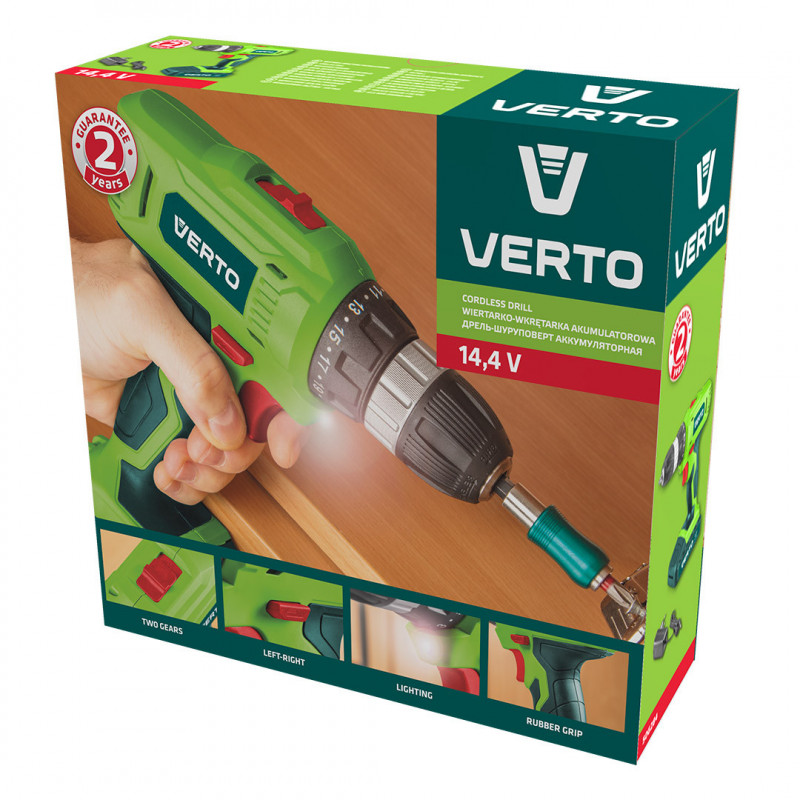 Wiertarko-wkrętarka akumulatorowa 14,4V, Li-Ion/1,3Ah, obroty I: 0-400 min⁻¹ II: 0-1500 min⁻¹, prawo/lewo, uchwyt samozaciskowy 0,8-10 mm, zakres momentu obrotowego 1-19 (oraz opcja wiercenia), ładowanie akumulatora 3-5 godz., hamulec wrzeciona, masa 1,2 kg, karton